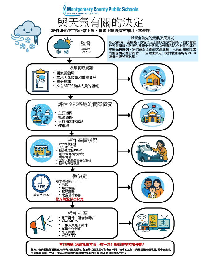 從凌晨2點(有時甚至在前一晚的深夜)開始, 我們的團隊便會檢查道路狀況、審視覆蓋全郡500多平方英里範圍的天氣預報, 並與運輸、設施和應急合作夥伴進行協商。蒙哥馬利郡幅員遼闊, 而且我們的校車、學生和工作人員為了參加計畫、體育活動和工作, 必須在全區範圍內長途跋涉。因此, 任何決定都必須適用於整個郡, 而不能只針對某一個社區。也請記得, 您孩子學校的工作人員不一定住在您家附近, 即使您所在地區的道路暢通無阻, 他們也可能無法上班…如果他們無法到學校, 學校就無法正常上課。