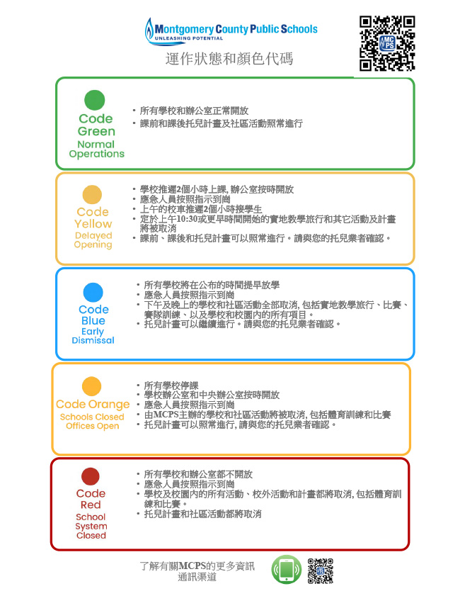 2025-2026學年的傳統校曆內含6天預留的緊急停課日, 我們將繼續使用顏色代碼系統讓家庭隨時清楚掌握最新狀況。有關每種顏色代碼的更多信息, 請訪問這個網站或使用二維碼。