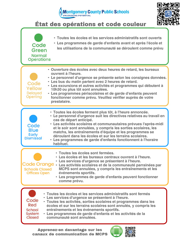 La sécurité reste notre priorité. C’est pourquoi le MCPS s’appuie sur un processus rigoureux et méthodique – et non sur des suppositions – pour décider si les écoles ouvrent à l’heure, retardent l’ouverture, libèrent les élèves plus tôt ou ferment leurs portes. Il peut être frustrant de constater que les conditions semblent bonnes dans votre quartier, mais que dans d'autres parties du comté, il existe de réels problèmes de sécurité ; la sécurité sera notre priorité.