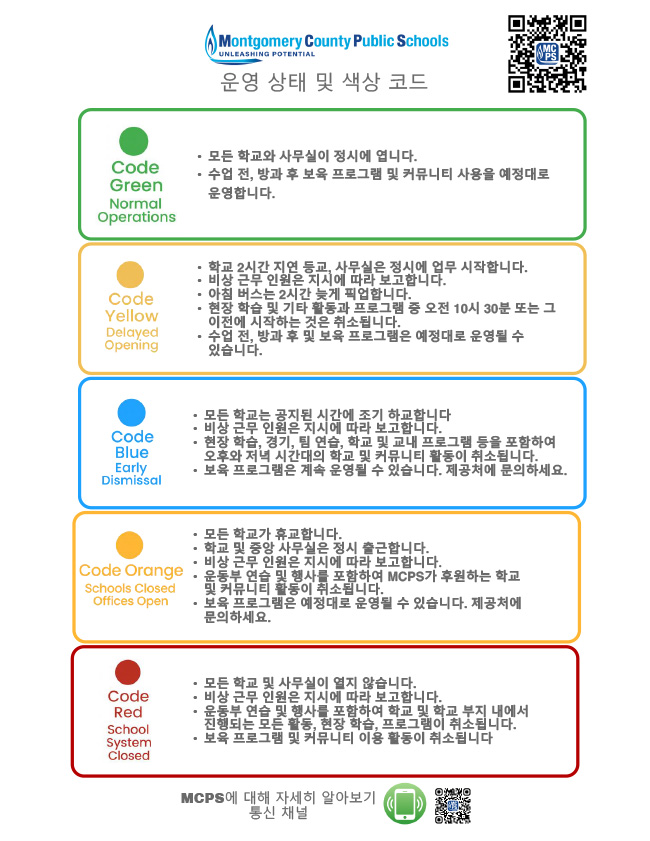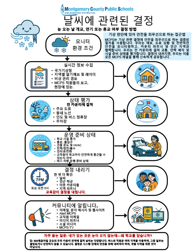 날이 점점 짧아지고 추워지면서, 우리는 조금의 눈과 얼음(혹은 많은 양의)을 맞이할지도 모릅니다. MCPS는 개교, 지연 개교 또는 눈으로 인한 휴교일 결정 시 학교 운영에 미치는 기상 관련 영향에 대해 시기적절하고 정확한 정보를 가족들에게 제공할 준비가 되어 있습니다.