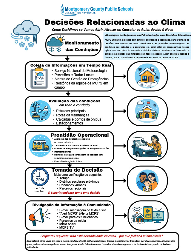 Segurança é sempre a nossa maior prioridade. Por isso, MCPS segue um processo passo a passo bem ensaiado—não adivinhações—para decidir se as escolas abrem no horário, atrasam, têm saída antecipada ou fecham. Pode ser frustrante quando as condições parecem boas na sua vizinhança, mas em outras partes do condado há riscos reais à segurança — a segurança vem sempre em primeiro lugar.